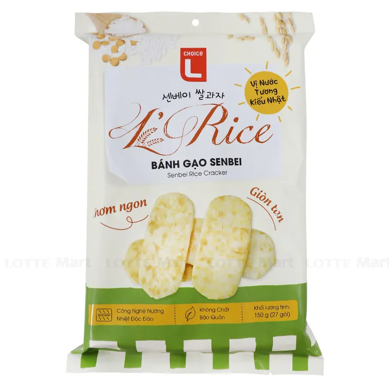 - Bánh Gạo Senbei Choice L Gói 150G có hình hình vuông, có lớp vỏ giòn tan và hương vị đặc trưng của gạo, đem lại cảm giác thơm ngon và độc đáo cho người thưởng thức. Với sản phẩm này bạn có thể dùng trong những bữa ăn nhẹ hoặc liên hoan. Sản phẩm được làm chủ yếu từ gạo Nhật và các gia vị chọn lọc, được sản xuất bằng công nghệ nướng nhiệt độc đáo không chiên qua dầu, không chứa chất bảo quản, phẩm màu, đảm bảo chất lượng.