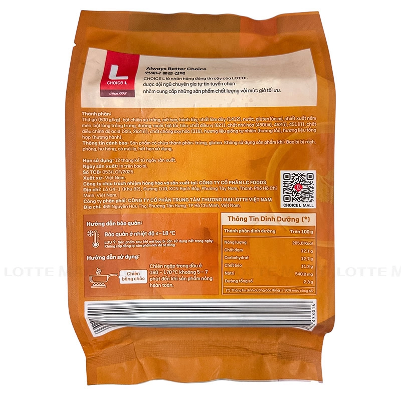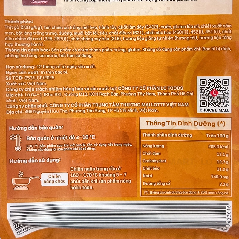 - Thịt gà (500g/kg), bột chiên xù trắng, mỡ heo, hành tây, chất làm dày (1412), nước, gluten lúa mì, chiết xuất nấm men, bột lòng trắng trứng, đường, muối, bột tỏi, tiêu, chất điều vị (621), chất nhũ hóa (450(iii), 452(i), 451(i)), chất điều chỉnh độ acid (325, 262(i)), chất chống oxy hóa (316), hương liệu giống tự nhiên (hương tỏi), hương liệu tổng hợp (hương hành).