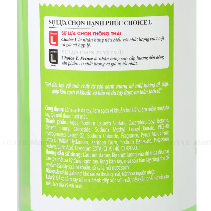 - Gel Rửa Tay Choice L Hương Táo là sản phẩm đặc phẩm được sản xuất bằng công nghệ hiện đại, chất lượng được đảm bảo giúp bạn yên tâm khi sử dụng.
