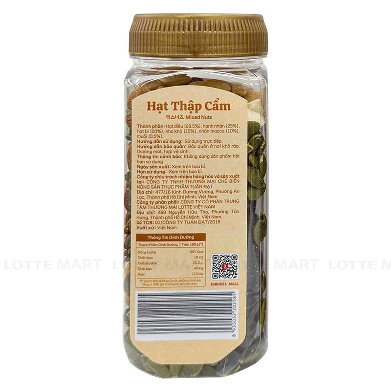 - Hạt điều (29.5%), Hạnh nhân (25%), Hạt bí (20%), Nho khô (15%), Nhân macca (10%), Muối (0,5%)...