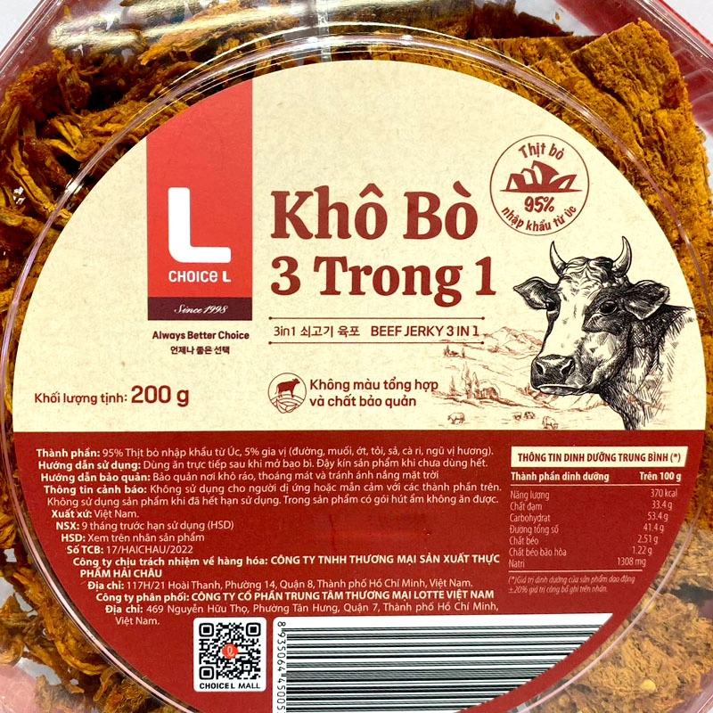 - Khô Bò 3 Trong 1 Choice L Hộp 200G gồm khô bò sợi, khô bò miếng, khô bò cục với 95% thành phần từ thịt bò tươi nhập khẩu từ Úc, kèm theo đường, muối, cari, ngũ vị hương. Thịt bò được lựa chọn kỹ lưỡng, tẩm gia vị, sấy khô giúp giữ hương vị bò tự nhiên, mềm dai, vừa ăn và không khô cứng.