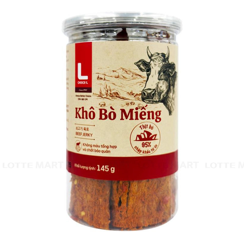 Khô Bò Miếng Choice L được sản xuất bằng 100% thịt bò nhập khẩu từ Úc, tẩm gia vị, sấy khô giúp giữ hương vị bò tự nhiên, giòn rụm và vừa ăn. Khi đưa lên miệng, thực khách sẽ cảm nhận được vị cay của ớt, vị mặn của muối hòa quyện cùng vị ngọt sẵn có trong từng thớ thịt bò tan nơi đầu lưỡi.