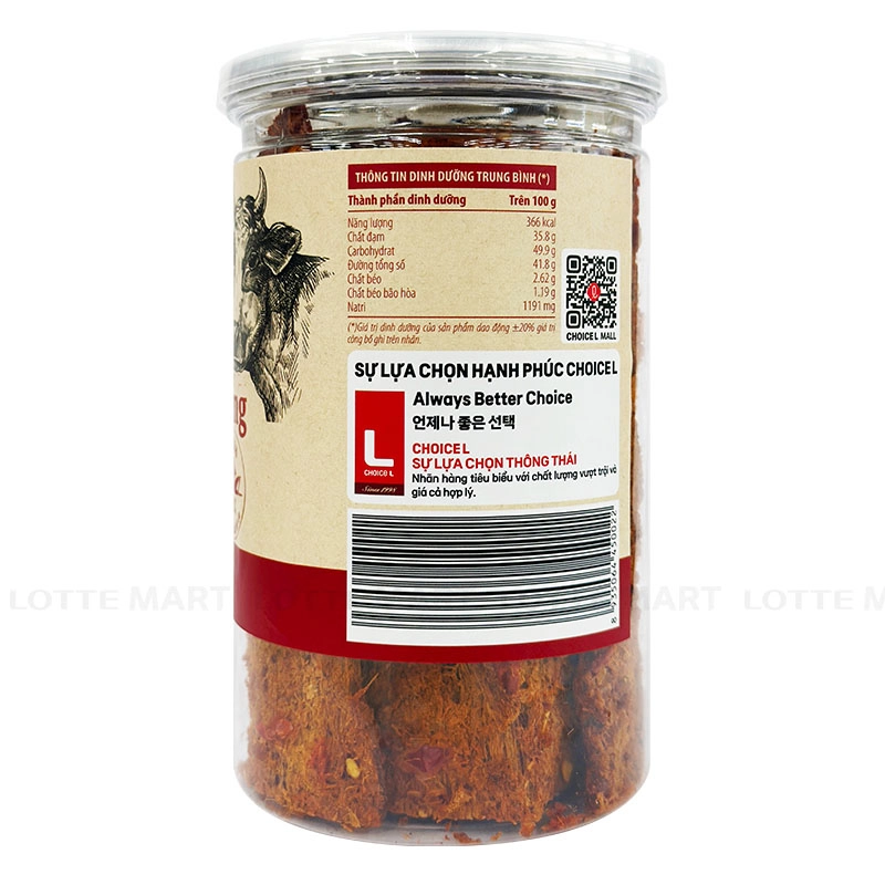 Đặc biệt sản phẩm thuộc nhãn hàng riêng của LOTTE Mart, nên đảm bảo chất lượng.Thành phần: 95% Thịt bò nhập khẩu từ Úc, 5% gia vị (đường, muối, ớt, cà ri, ngũ vị hương).Hướng dẫn sử dụng: Sau khi mở bao bì ăn liền, đậy kín sản phẩm khi chưa dùng hết.