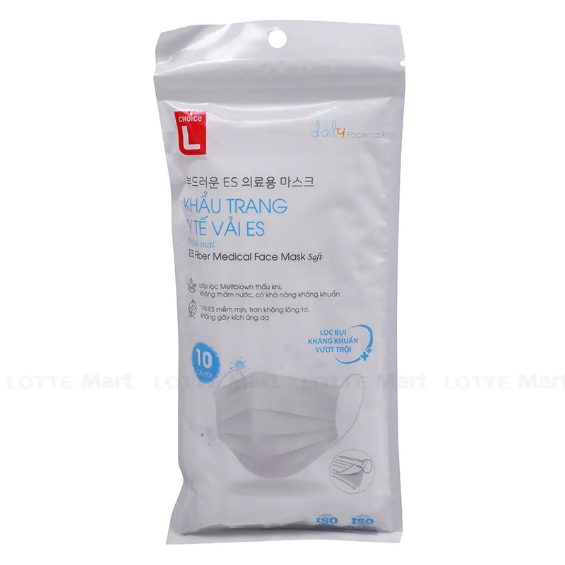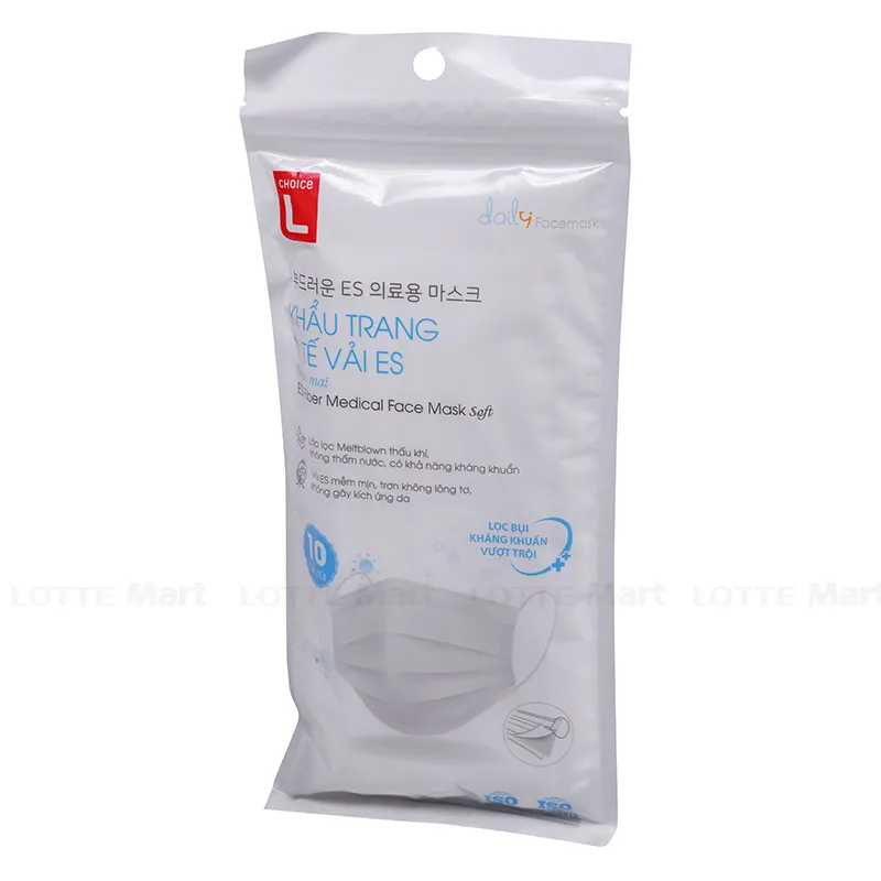 - Khẩu Trang Y Tế Vải ES Choice L Lọc Bụi Kháng Khuẩn Vượt Trội Túi 10 Cái có tác dụng ngăn ngừa bụi, vi khuẩn, virus và các bệnh lây qua đường hô hấp nhờ lớp lọc kháng khuẩn cao cấp. Khẩu trang được sản xuất ở Việt Nam với dây chuyền công nghệ khép kín. Chất liệu vải tự nhiên, dày mịn, không gây khó chịu.Thanh nẹp mũi thiết kế thông minh giúp định hình giữ khẩu trang. Sản phẩm không thấm nước, không gây dị ứng da, an toàn cho người sử dụng. Dây deo đàn hồi mềm mại, không gây cảm giác đau tai khi sử dụng lâu dài, thiết kế thông minh nên giúp dễ dàng hít thở, đem lại cảm giác thoải mái khi đeo.