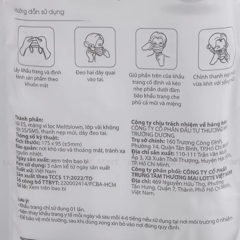 - Lưu ý: Sử dụng một lần, không tái sử dụng sau khi giặt. Không kéo quai thun quá mạnh để tránh bị giãn lỏng. Trường hợp bị kích ứng da, ngưng sử dụng và đến cơ sở y tế dể kiểm tra. Không sử dụng khi ở gần lửa hoặc khi xảy ra hoả hoạn. Một số trường hợp kính mắt có thể mờ khi sử dụng khẩu trang, nên cẩn thận khi lái xe.