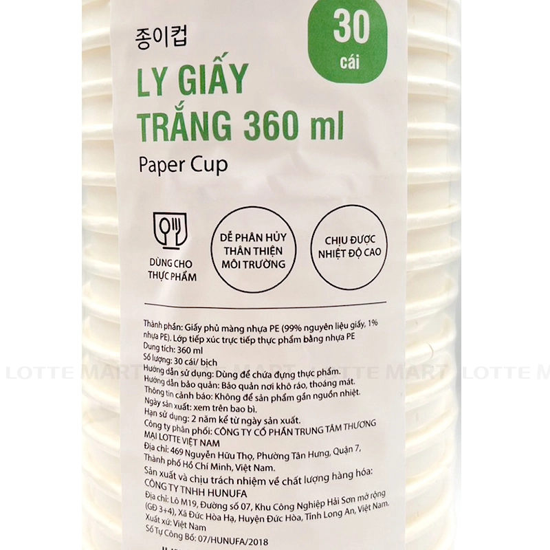 Thành phần: Giấy phủ màng nhựa PE (99% nguyên liệu giấy, 1% nhựa PE). Lớp tiếp xúc trực tiếp thực phẩm bằng nhựa PE.