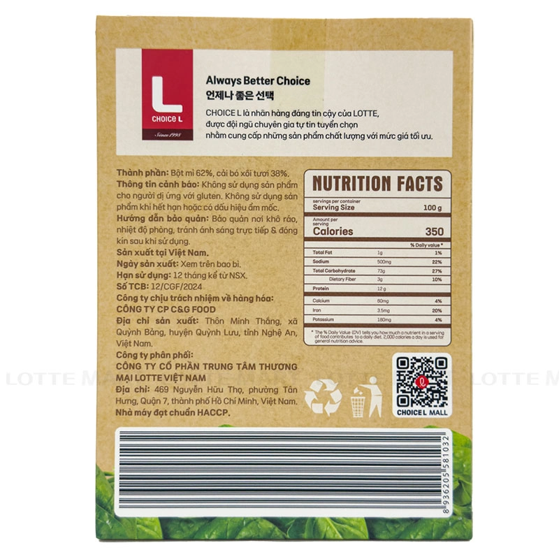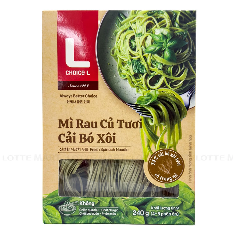 - Mì Rau Củ Tươi Cải Bó Xôi Choice L Hộp 240G là một thực phẩm khô bổ dưỡng và tiện lợi, với thành phần chính từ bột mì và tinh chất rau củ, thành phẩm cho sợi mì mướt - mọng - ngọt - tươi khi chế biến.