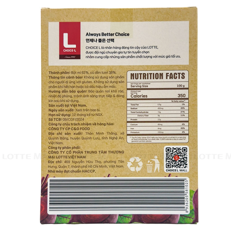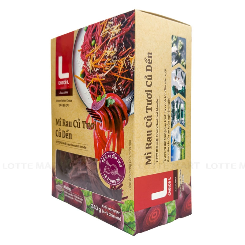 - Mì Rau Củ Tươi Củ Dền Choice L Hộp 240G là một thực phẩm khô bổ dưỡng và tiện lợi, với thành phần chính từ bột gạo và tinh chất rau củ, thành phẩm cho sợi mì dai mềm khi chế biến.