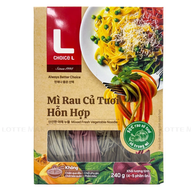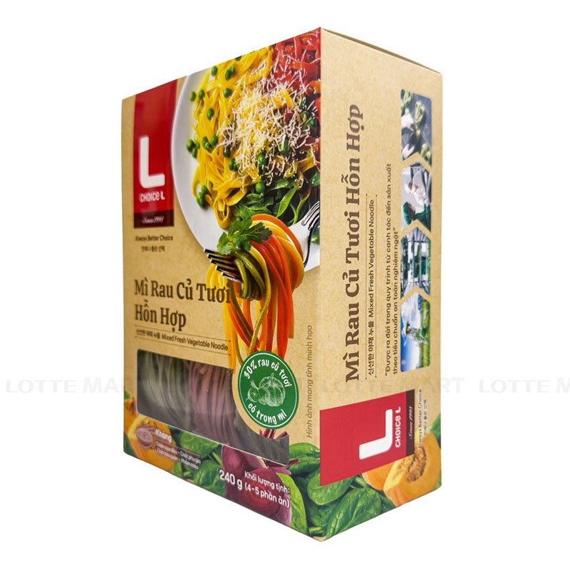 - Mì Rau Củ Tươi Hỗn Hợp Choice L Hộp 240G là một thực phẩm khô bổ dưỡng và tiện lợi, với thành phần chính từ bột gạo và tinh chất rau củ, thành phẩm cho sợi mì Mướt - Mọng - Ngọt - Tươi khi chế biến.