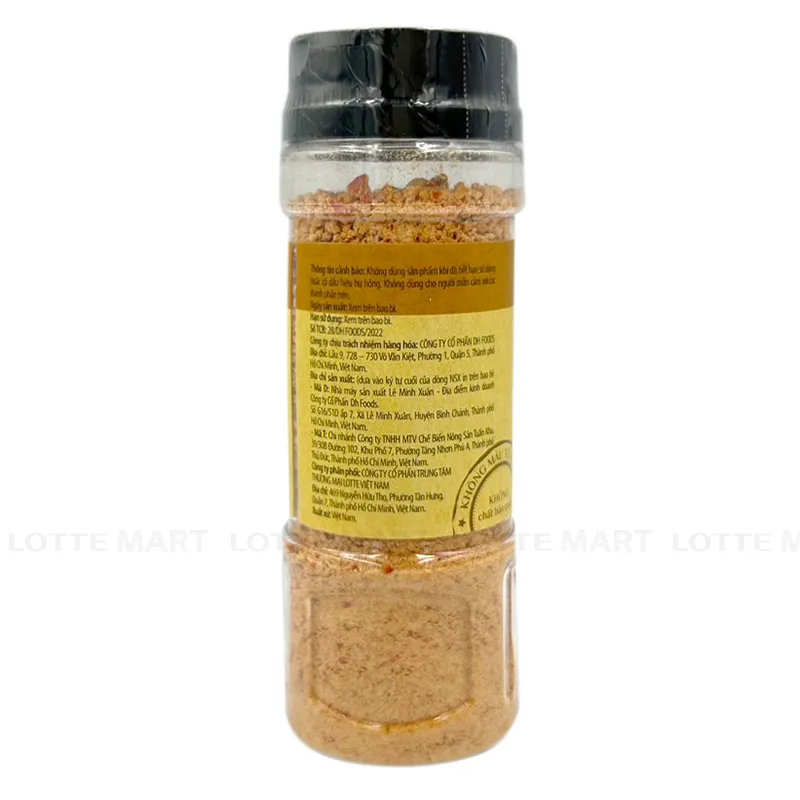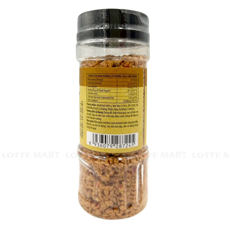 - Muối Iod (40%), bột tôm (15%), ớt (15%), tỏi, chất điều vị (621), đường, phẩm màu tự nhiên (160c(i)).