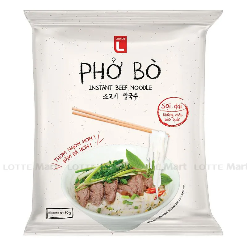 Phở Bò Choice L Gói 60G sở hữunhững sợi phở to, dẹp, trắng dai ngon hòa quyện cùng với nước dùng thơm lừng hương vị bò truyền thống, tạo nên món ăn vô cùng hấp dẫn người dùng đến sợi bánh cuối cùng.
