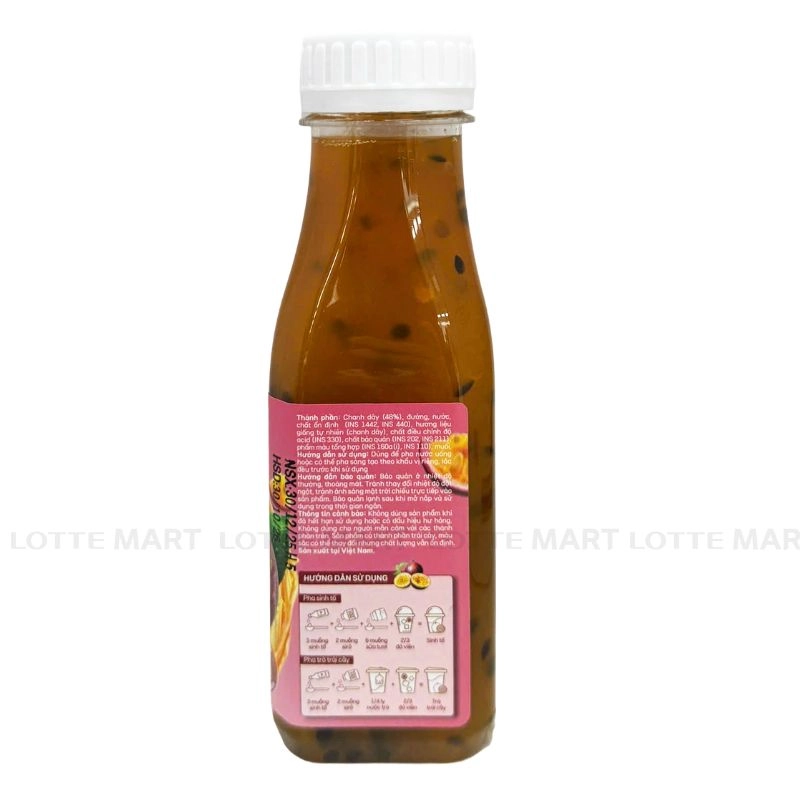 - Chanh dây (48%), đường, nước, chất ổn định (INS 1442, INS 440), hương liệu tổng hợp (chanh dây), chất điều chỉnh độ acid (INS 330),chất bảo quản (INS 202, INS 211), phẩm màu tổng hợp (INS 160a(i), INS 110), muối.