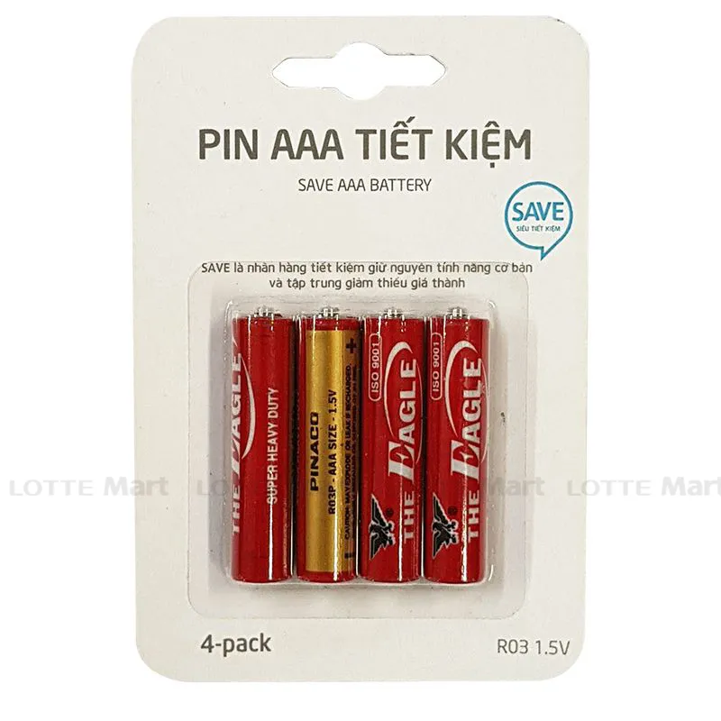Vỉ 4 Pin AAA là một loại pin khô kích cỡ tiêu chuẩn thường được dùng trong các thiết bị điện tử cầm tay. Một pin kẽm-cacbon với kích cỡ này được IEC phân loại là