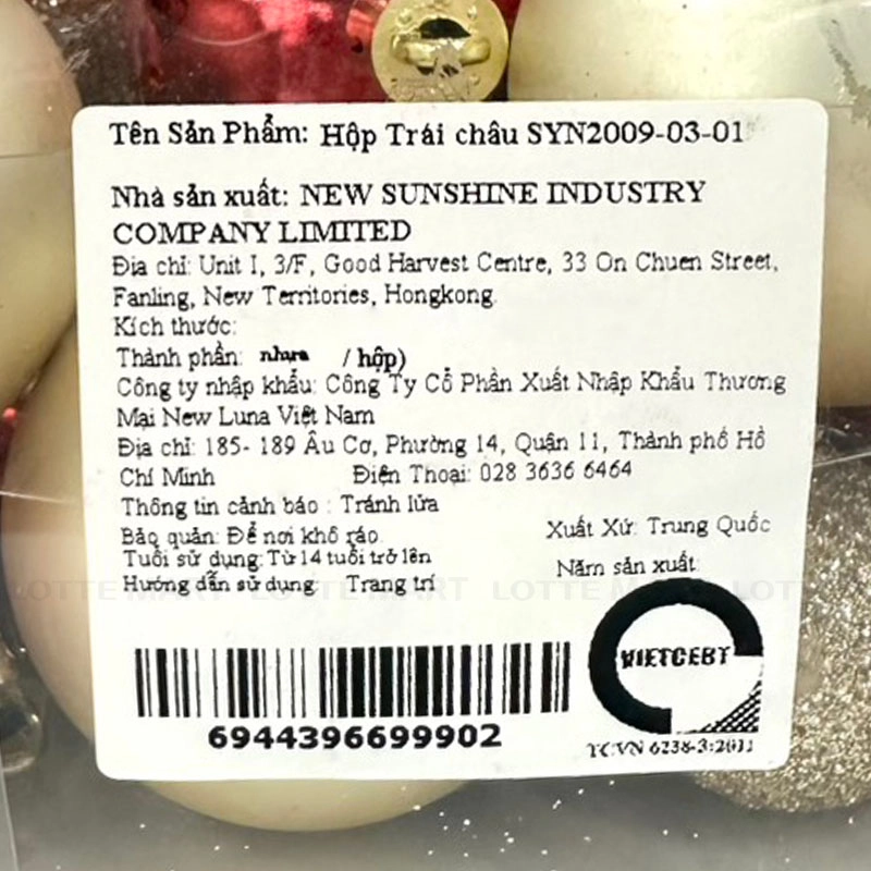 - Hộp Trái Châu SYN2009-03-01 gồm các trái châu trang trí Giáng sinh đầy màu sắc, nổi bật với trái châu hình ngôi sao phủ nhũ lấp lánh - điểm nhấn lý tưởng giúp không gian trang trí trở nên rực rỡ và sinh động.