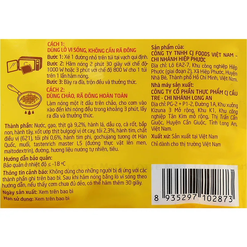 - Nước, gạo, thịt gà 9.2%, hành lá, dầu cọ, bắp non, hành tây, xốt ướp thịt bulgogi vị cay, tỏi 2.3%,...