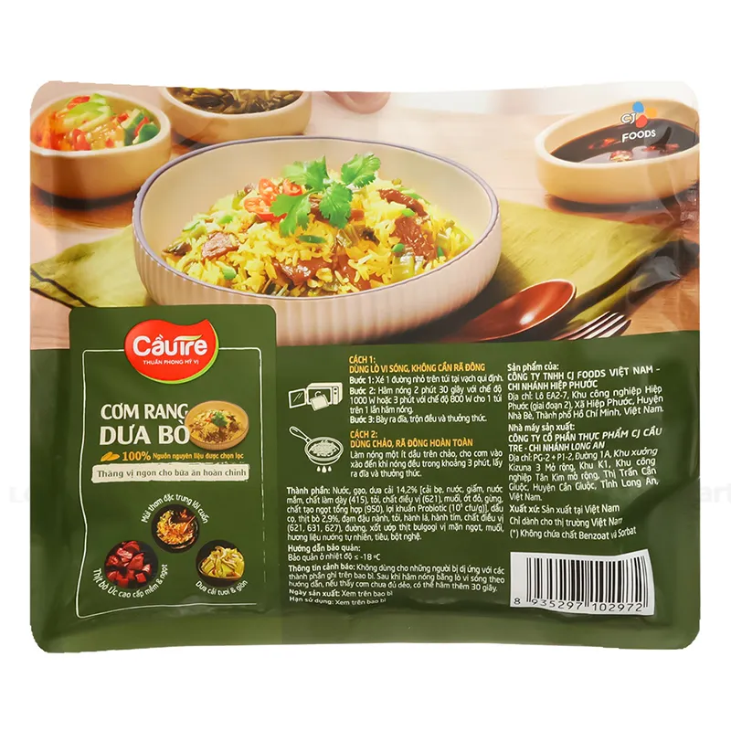 Cơm Rang Dưa Bò CJ Foods Gói 210g thơm ngon, dinh dưỡng lại vô cùng đậm đà gia vị. Cơm rang dưa bò được làm từ những nguyên liệu sạch, tươi ngon. Thực phẩm chế biến sẵn luôn mang chất lượng, an toàn, tạo cho người dùng cảm giác ngon miệng, kích thích vị giác. Sản phẩm còn được yêu thích và tin dùng bởi những ưu điểm sau: