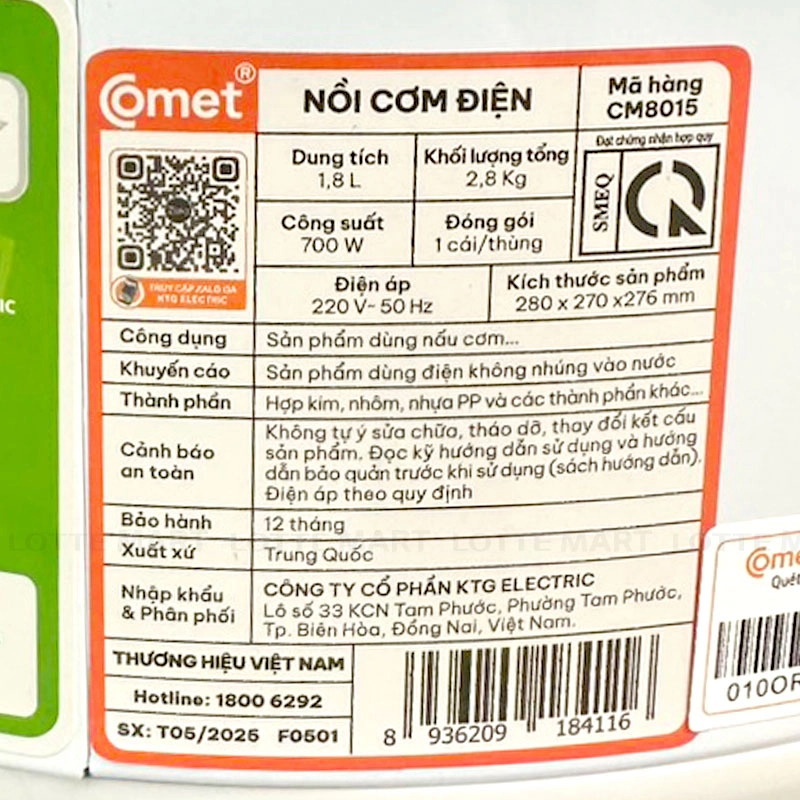 - Nồi Cơm Điện Comet CM8015 1.8L là lựa chọn tiện lợi cho gia đình 4-6 người với công suất 700W giúp cơm chín nhanh và đều.