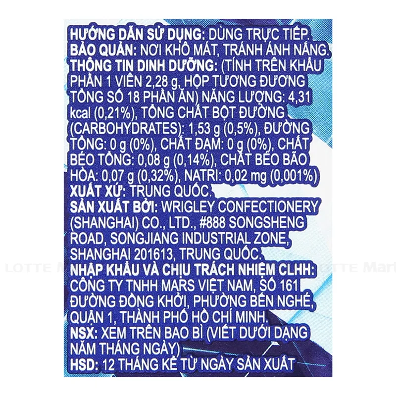 - Chất tạo ngọt nhân tạo và tự nhiên (xylitol, sorbitol, maltitol, xi rô maltitol,...), chất gum nền, hương liệu (bạc hà) tự nhiên, giống tự nhiên và nhân tạo, chất làm ẩm, chất nhũ hóa, chất làm dầy, chất chống oxy hóa, màu thực phẩm tổng hợp,...