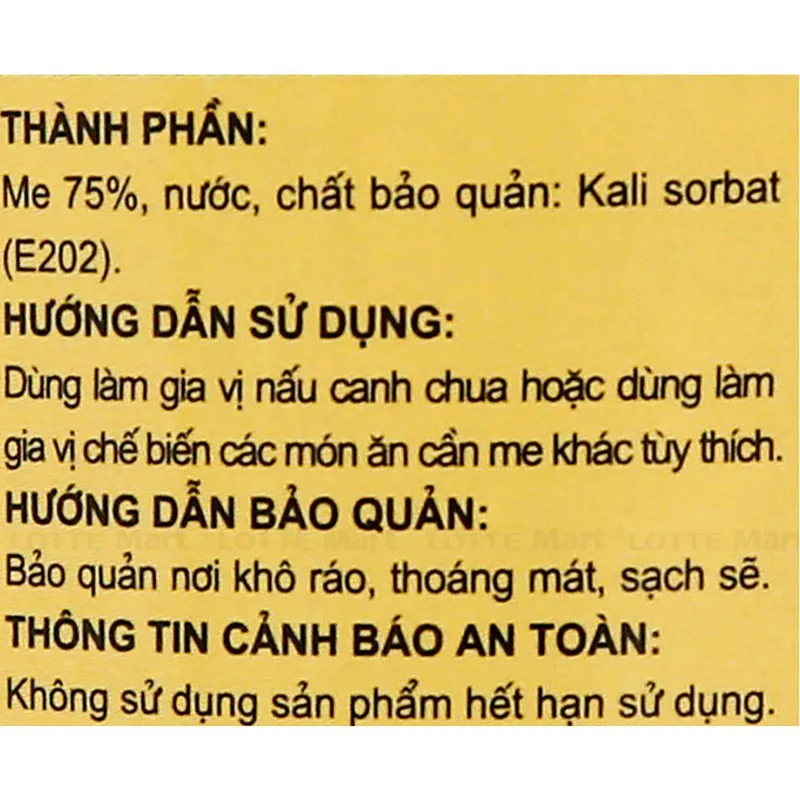 - Sản phẩm được làm từ những quả me chín tuyển chọn thơm ngon, sản phẩm có thể dùng làm gia vị nấu canh chua hoặc dùng làm gia vị chế biến món ăn cần me tùy thích.