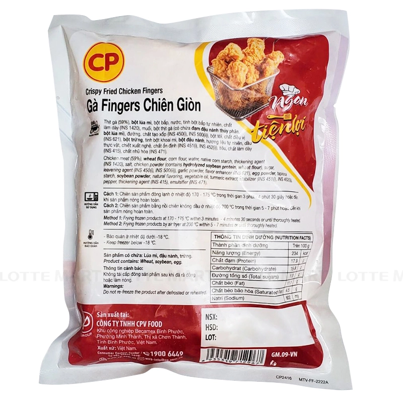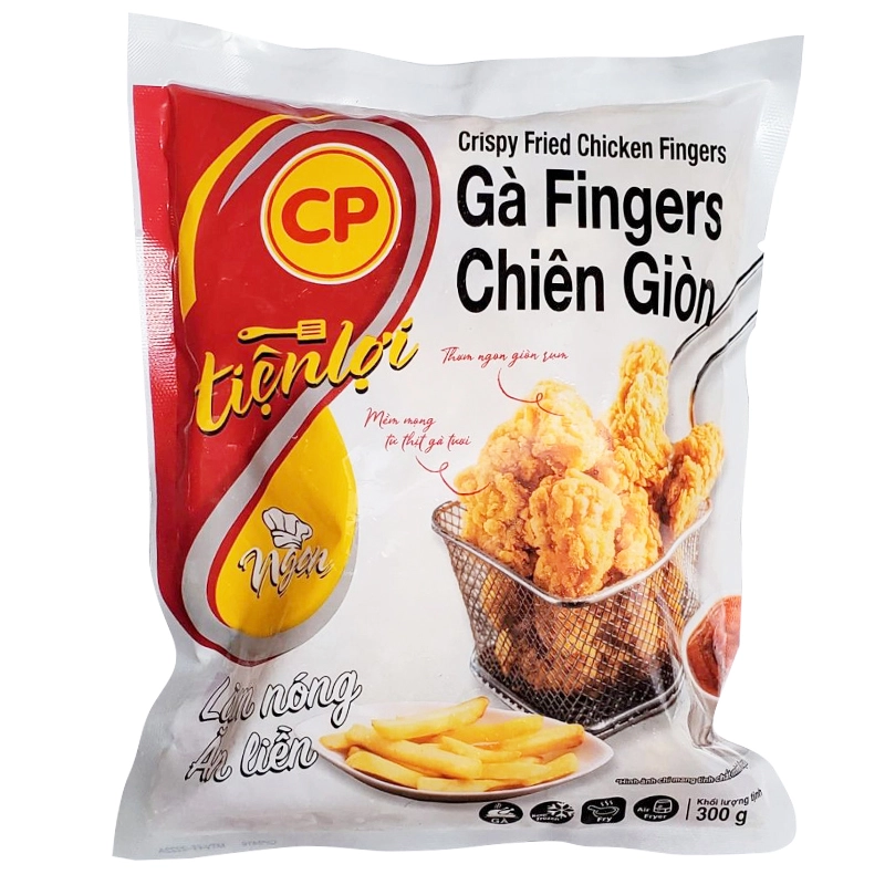 - Gà Fingers Chiên Giòn CP là món ăn làm sẵn, thơm ngon và cực kỳ tiện lợi, được sản xuất bởi thương hiệu thực phẩm nổi tiếng CP, đảm bảo chất lượng và an toàn cho người tiêu dùng. Với nguyên liệu chính là thịt gà tươi ngon, được lựa chọn kỹ lưỡng mang lại hương vị đậm đà, giàu dinh dưỡng và hấp dẫn ngay từ lần thưởng thức đầu tiên.
