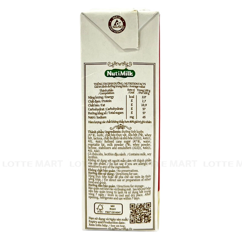 Thành phần: Đường tinh luyện (47%), nước, chất béo thực vật, sữa bột, whey bột, lactoza, chất ổn định và nhũ hóa (E322, E460, E401, E466). Có chứa sữa, lecithin đậu nành.