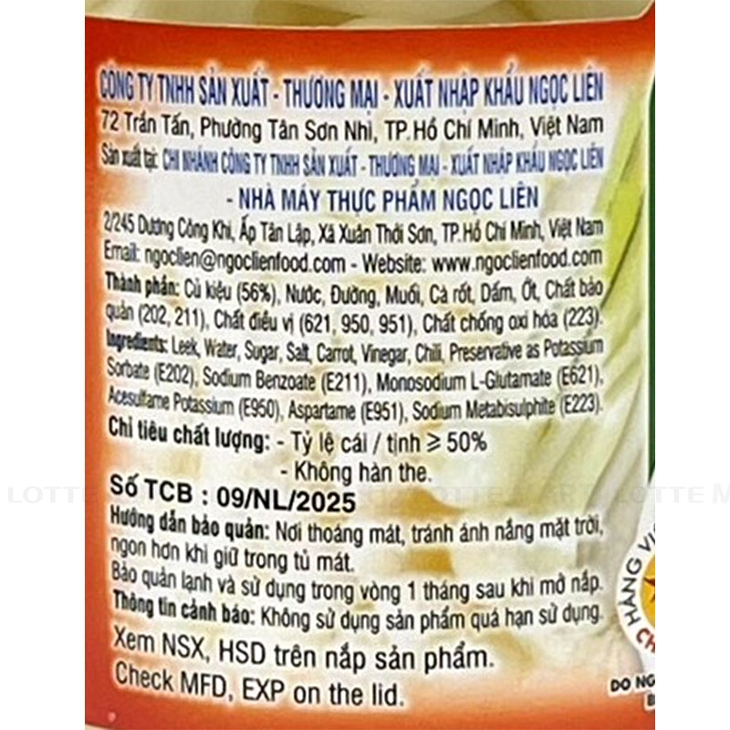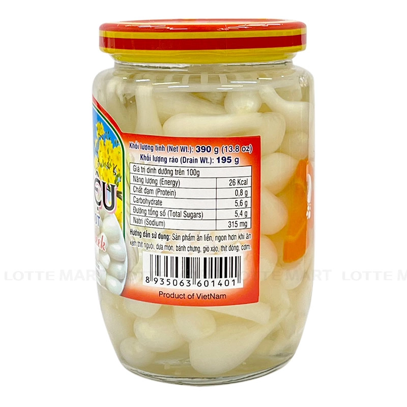 Thành phần: Củ kiệu, dấm, nước, muối, đường… Sử dụng: Dùng như đồ chua. Bảo quản: Bảo quản nơi thoáng mát, tránh ánh nắng mặt trời. Nơi sản xuất: Việt Nam.