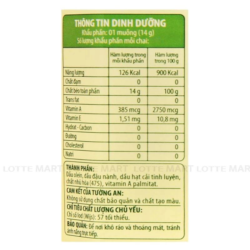 Thành phần dầu ăn Dầu ăn Tường An Cooking Oil Nhãn Đỏ: Dầu olein, dầu đậu nành, dầu hạt cải tinh luyện…