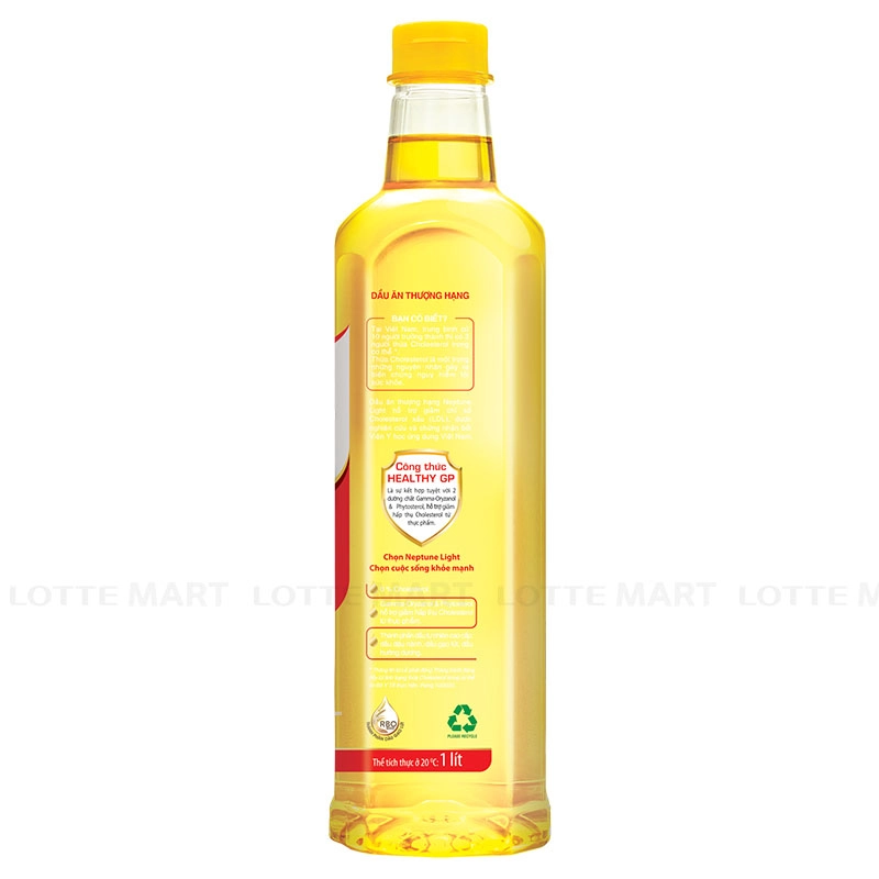 Dầu ăn thượng hạng Neptune Light, không chứa cholesterol, đặc biệt với công thức Healthy GP - sự kết hợp tốt 2 dưỡng chất Gamma-Oryzanol & Phytosterol, hỗ trợ cơ thể giảm hấp thụ cholesterol từ thực phẩm. Sản phẩm được Viện Y học ứng dụng Việt Nam nghiên cứu và chứng nhận.