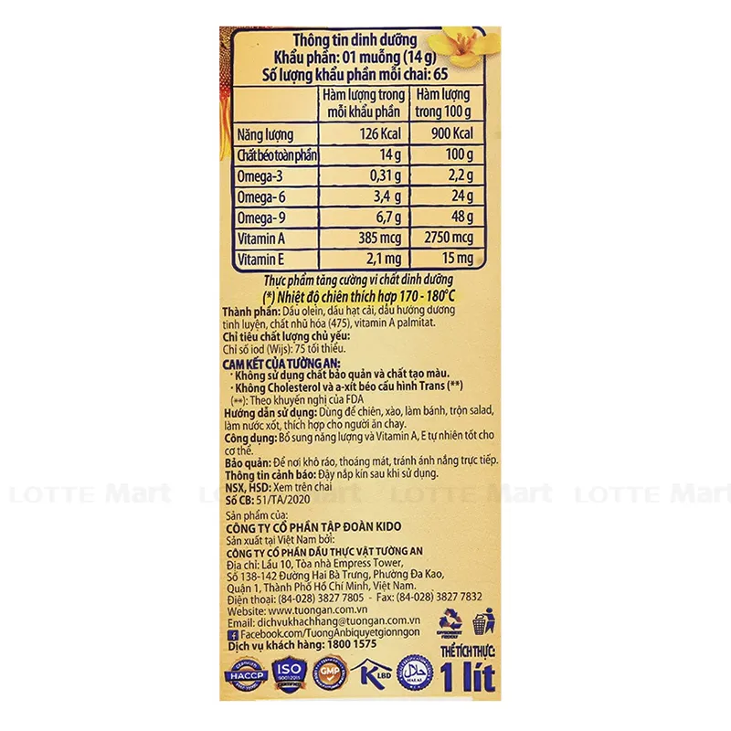 Thành phần: Dầu Olein, dầu hạt cải, dầu hướng dương tinh luyện, Vitamin A. Dầu hướng dương: giàu vitamin E tự nhiên, là chất chống oxy hóa bảo vệ cơ thể. Dầu hạt cải: giàu Omega 3,6,9 tốt cho hệ tim mạch. Dầu Olein cao cấp: thích hợp chiên, rán ở nhiệt độ cao cho các món giòn thơm trọn vị. Dầu ăn giàu các dưỡng chất tự nhiên như Omega 3, vitamin A, E với tác dụng ngăn ngừa ung thư và chống oxy hóa hiệu quả.