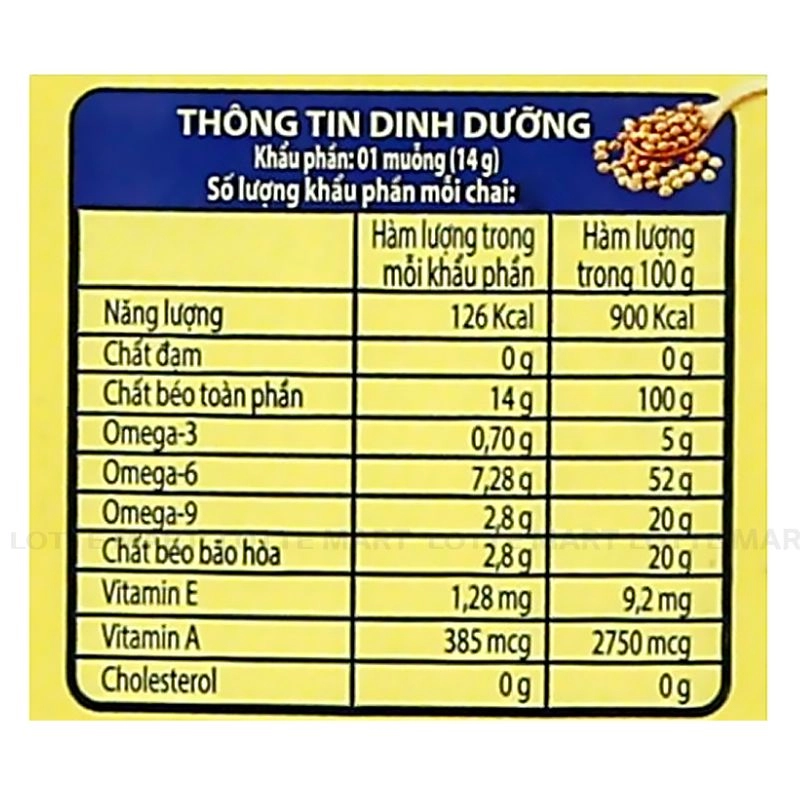 Được tinh chế từ các hạt đậu nành tự nhiên chọn lọc, không chỉ giúp các món ăn thơm ngon hơn mà còn chứa nhiều dưỡng chất tốt cho sức khoẻ của cả nhà. Chai dung tích 1 lít, thích hợp cho nhu cầu của mọi gia đình và người dùng ở mọi lứa tuổi khác nhau. Thành phần 100% dầu đậu nành nguyên chất tinh luyện, vitamin A. Ưu điểm: Nguyên liệu nhập khẩu 100%; chiết xuất từ 100% đậu nành nguyên chất, giàu Omega 3-6-9 tốt cho tim mạch. Dầu đậu nành Tường An 100% nguyên chất 1 lít được tinh chế từ các hạt đậu nành tự nhiên chọn lọc, không chỉ giúp các món ăn thơm ngon hơn mà còn chứa nhiều dưỡng chất tốt cho sức khoẻ của cả nhà. Thích hợp Chiên, xào, trộn salad, làm sốt. Bảo quản: Nơi thoáng mát, nên dùng trong 1 tháng sau khi mở nắp.