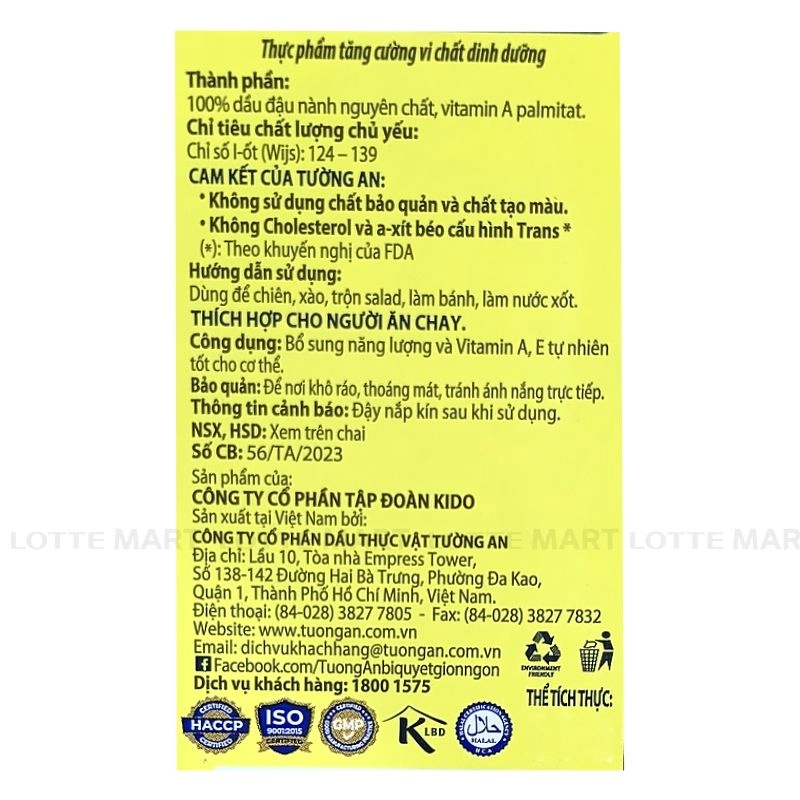 Dầu nành Tường An có thành phần nguyên liệu được lựa chọn kỹ lưỡng, đảm bảo vệ sinh an toàn thực phẩm. Dầu đậu nành cung cấp nhiều dưỡng chất như Omega 3, 6, 9 và Vitamin E tự nhiên, không có Cholesterol, bảo đảm sản phẩm tốt cho sức khỏe tim mạch. Thành phần dầu đậu nành tinh luyện có hàm lượng dinh dưỡng cao sẽ giúp bạn dễ dàng chế biến những món ăn bảo vệ sức khỏe cho gia đình bạn. Dầu nành Tường An không sử dụng chất bảo quản và chất tạo màu, bảo đảm an toàn cho sức khỏe người dùng. Sản phẩm được đóng thành can an toàn, hợp vệ sinh, thuận tiện cho việc sử dụng và bảo quản. Hướng dẫn sử dụng: Dùng để chiên, xào, làm bánh, trộn salad, làm nước sốt, thích hợp cho người ăn chay, người bệnh tim mạch - Hướng dẫn bảo quản: Để nơi khô ráo và thoáng mát, tránh ánh nắng trực tiếp