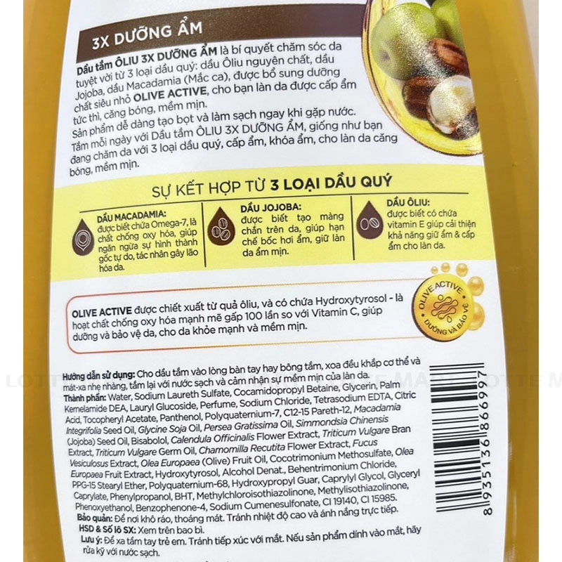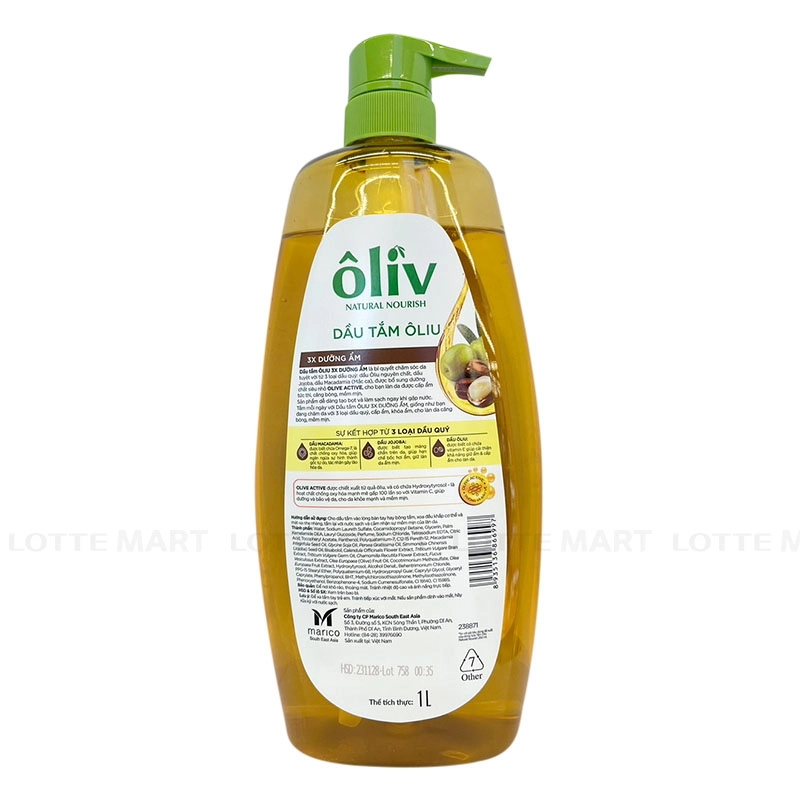 Dầu Tắm Oliv X3 Dưỡng Ẩm cung cấp dầu ôliu nguyên chất, vitamin E và axit béo giúp dưỡng tóc khỏe mạnh.