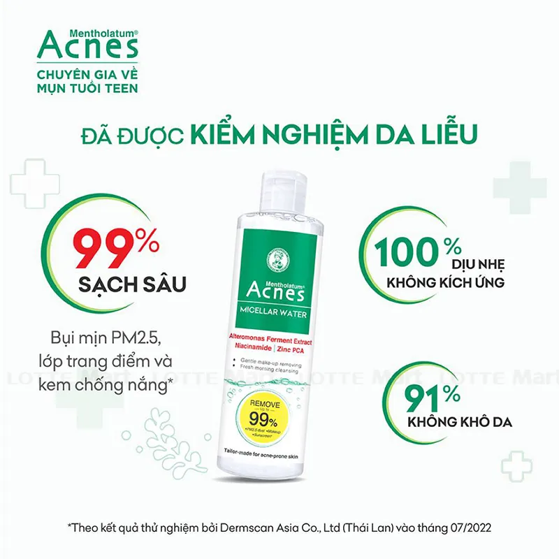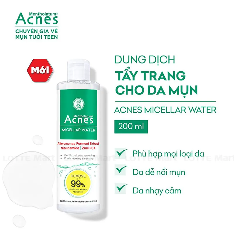 Dung Dịch Tẩy Trang Acnes Micellar Water Cho Da Mụn Chai 220ml là sản phẩm tẩy trang mới từ thương hiệu Acnes, với công thức chuyên biệt dành cho da mụn, giúp tẩy trang và làm sạch dịu nhẹ mà không gây khô da. Đặc biệt, sản phẩm có khả năng làm sạch bụi mịn PM2.5 lên đến 99% cũng như kiềm dầu, kháng khuẩn và hỗ trợ ngăn ngừa hình thành mụn.