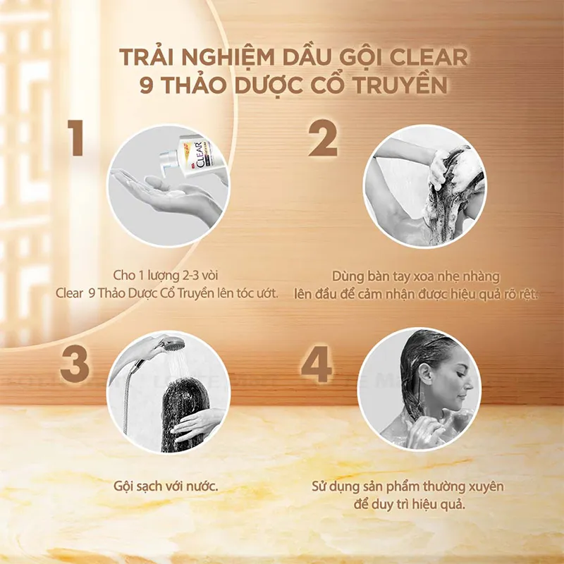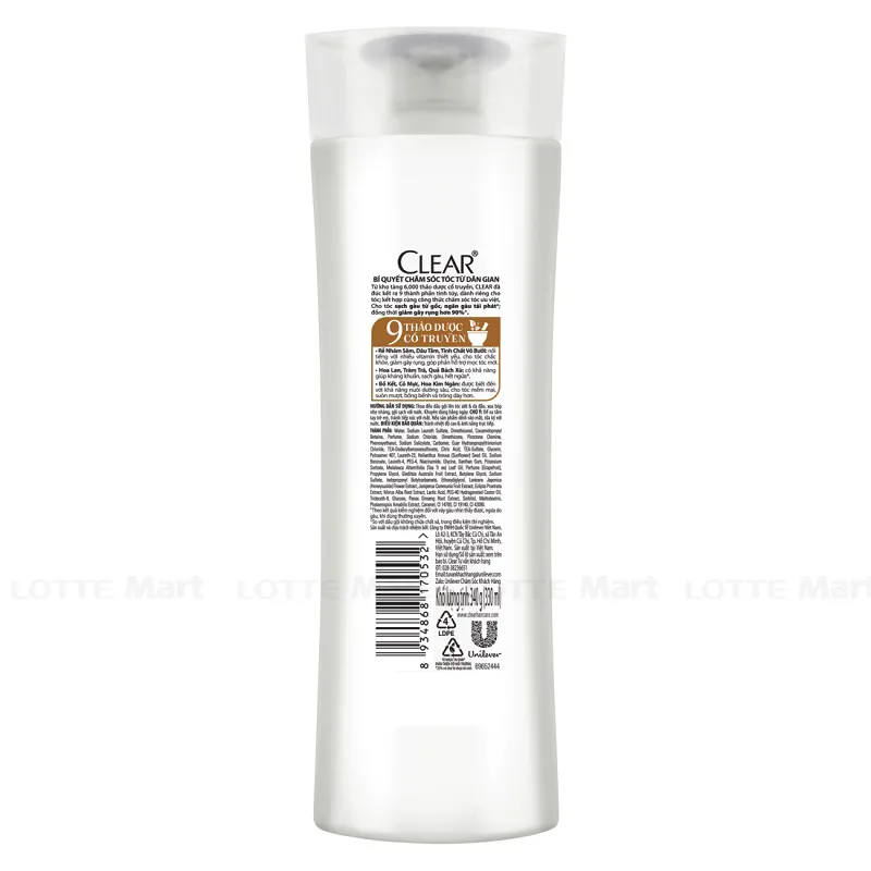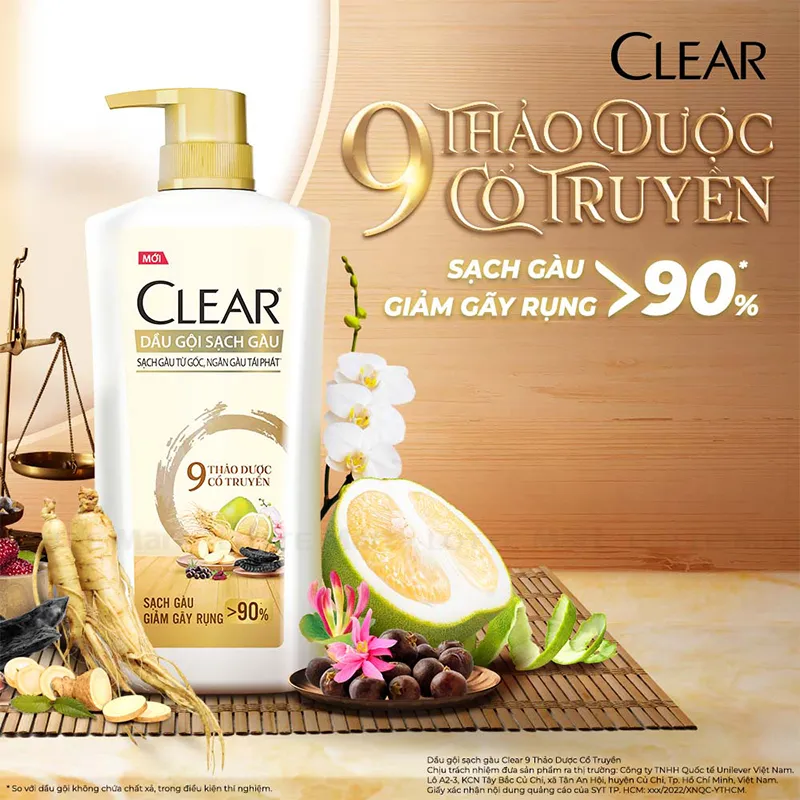 - CLEAR đã tinh tuyển và tỉ mẩn chọn ra 9 dược liệu dưỡng tóc từ kho tàng 6000 thảo dược cổ truyền cho da đầu gồm Nhân sâm, Vỏ Bưởi, Bồ Kết, Cỏ Mực, Hoa Kim Ngân, Dâu Tằm, Hoa Lan, Tràm Trà, Quả Bách Xù kết hợp cùng công nghệ sạch gàu, giúp sạch gàu từ gốc, ngăn gàu tái phát.