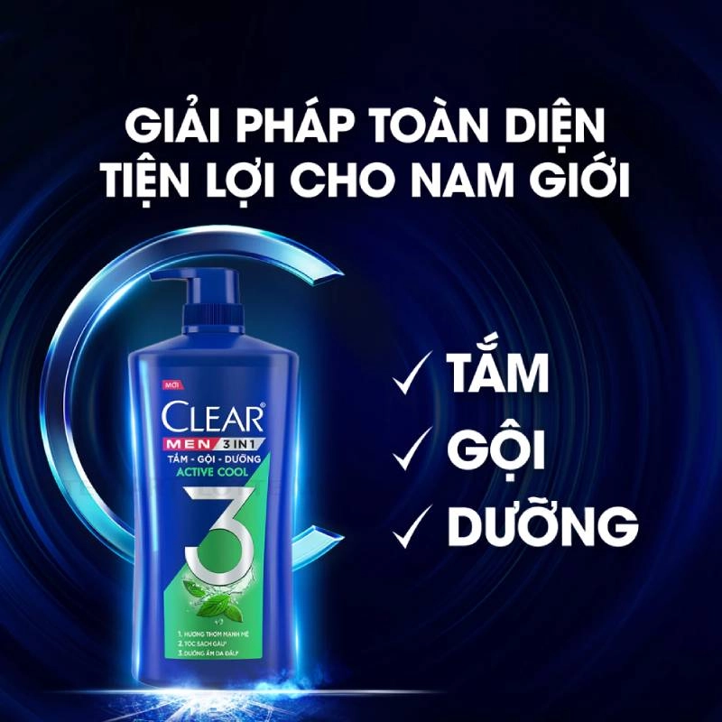 - Dầu Gội Dành Cho Nam Clear Men 3 In 1 Tắm, Gội, Dưỡng Active Cool là sản phẩm dầu gội được nghiên cứu dành riêng cho nam giới, giúp tóc sạch gàu với công thức Gel đột phá, đồng thời dưỡng ẩm da đầu và làn da, cho da luôn được cấp ẩm nhờ Hyaluronic Acid (HA).