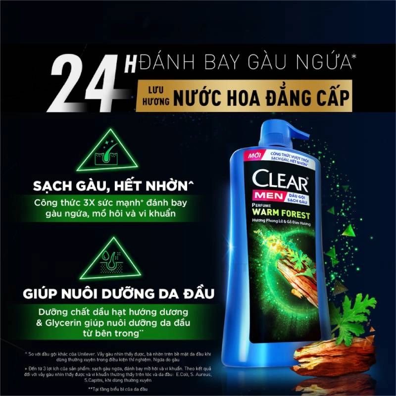 - Dầu Gội Sạch Gàu Dành Cho Nam Clear Men Hương Phong Lữ và Gỗ Đàn Hương là sản phẩm dầu gội được thiết kế dành cho phái nam, gây ấn tượng ban đầu bằng mùi gỗ Đàn Hương trầm ấm, sau đó phối hoà bằng hương Phong Lữ dịu nhẹ, khắc họa rõ nét chân dung người đàn ông tinh tế mà cũng không kém phần mạnh mẽ.