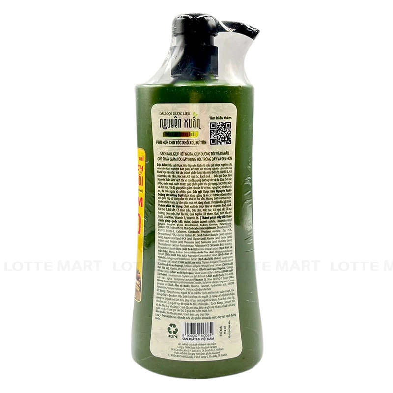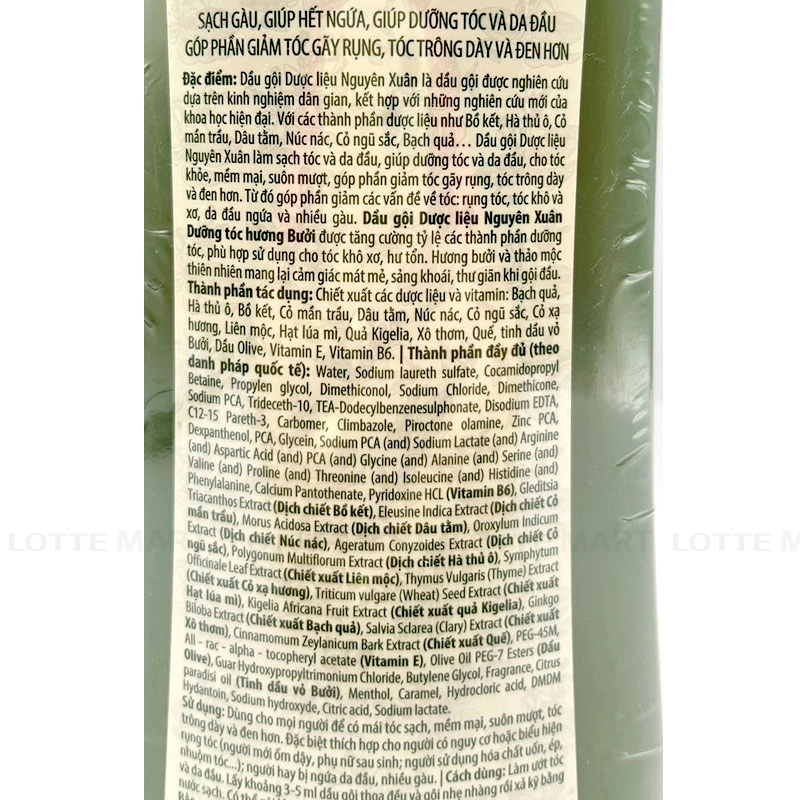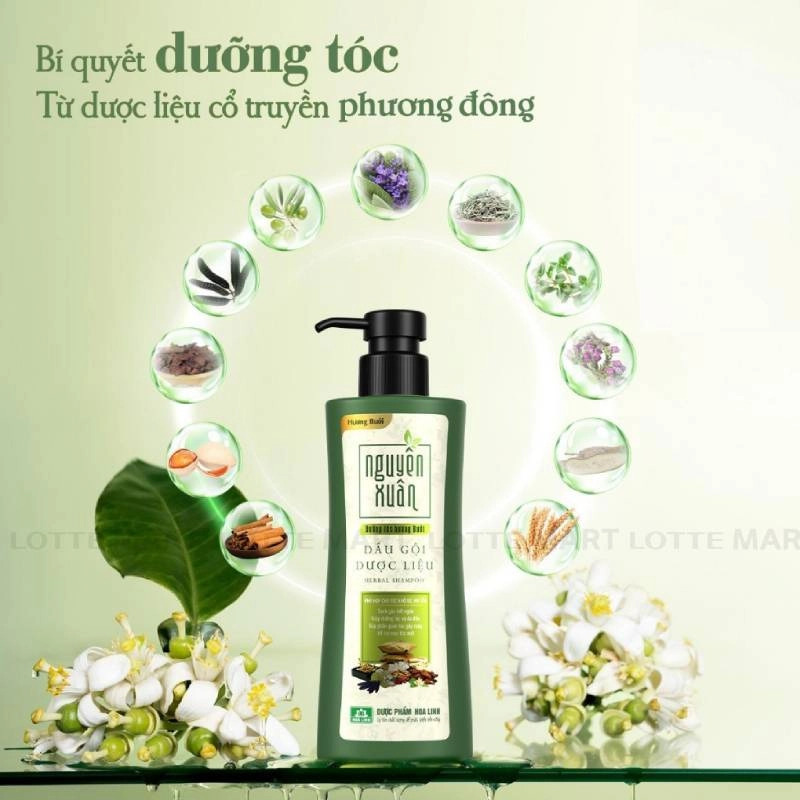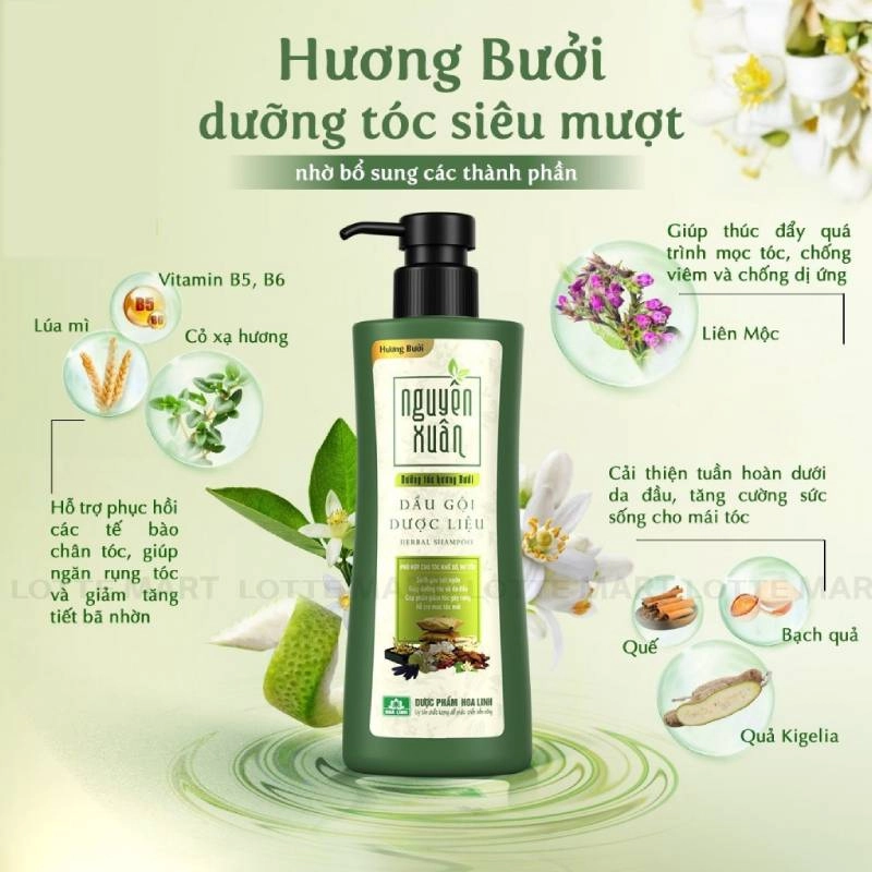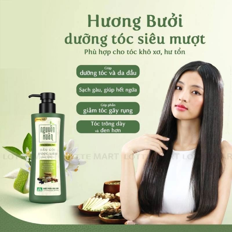- Dầu Gội Dược Liệu Nguyên Xuân Hương Bưởi Dưỡng Tóc là sản phẩm dầu gội đến từ thương hiệu Nguyên Xuân, được sản xuất với các thành phần dược liệu cổ truyền phương Đông như Bạch quả, Hà thủ ô, Bồ kết, Cỏ mần trầu, Cỏ xạ hương, Liên mộc… giúp làm sạch tóc, da đầu, sạch gàu.