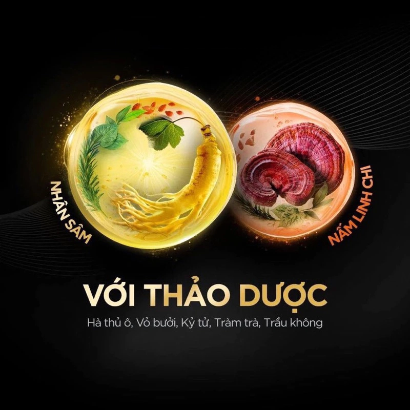 - Dầu gội với thành phần chiết xuất từ Nhân Sâm cùng 6 loại thảo dược Hà thủ ô, Trầu không, Hương thảo, Nấm linh chi, Câu kỷ tử, Tràm trà, chiết xuất bưởi hồng từ thiên nhiên giúp tóc chắc khỏe và ngăn ngừa tình rạng rụng tóc lên đến 99% thường xảy ra ở phái mạnh.