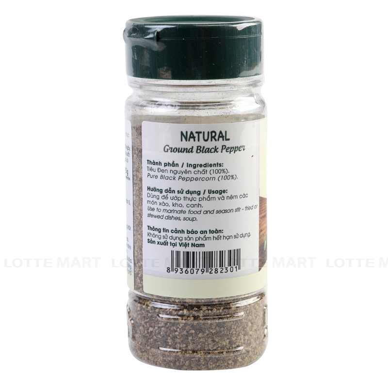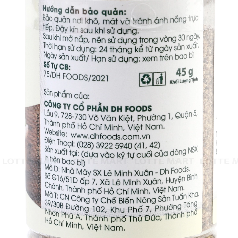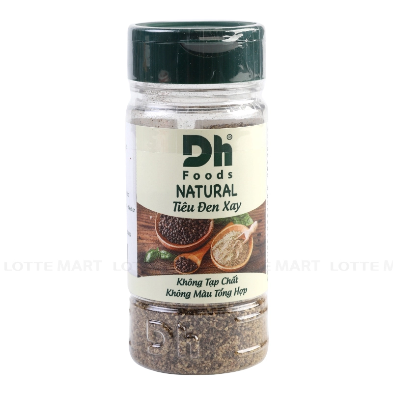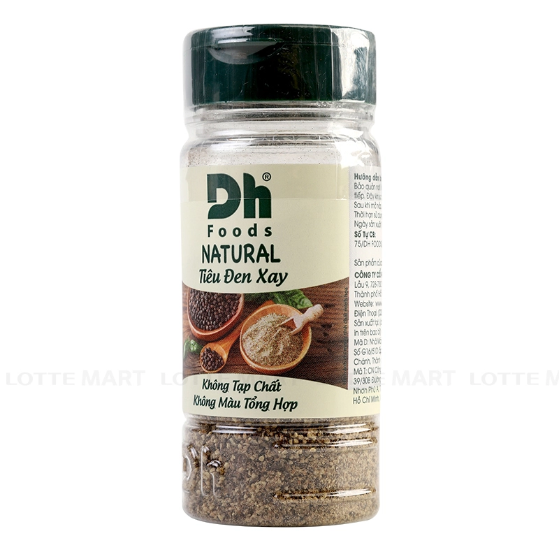 - Tiêu Đen Xay DH Foods Chai 40G có nguồn gốc từ Tây Nguyên. Tiêu được mang về từ vựa, chọn lọc kĩ lưỡng những hạt chắc mẩy, nổi bật để làm sạch, xay ra và đóng gói mà không hề pha trộn bất kì một loại tạp chất nào khác.