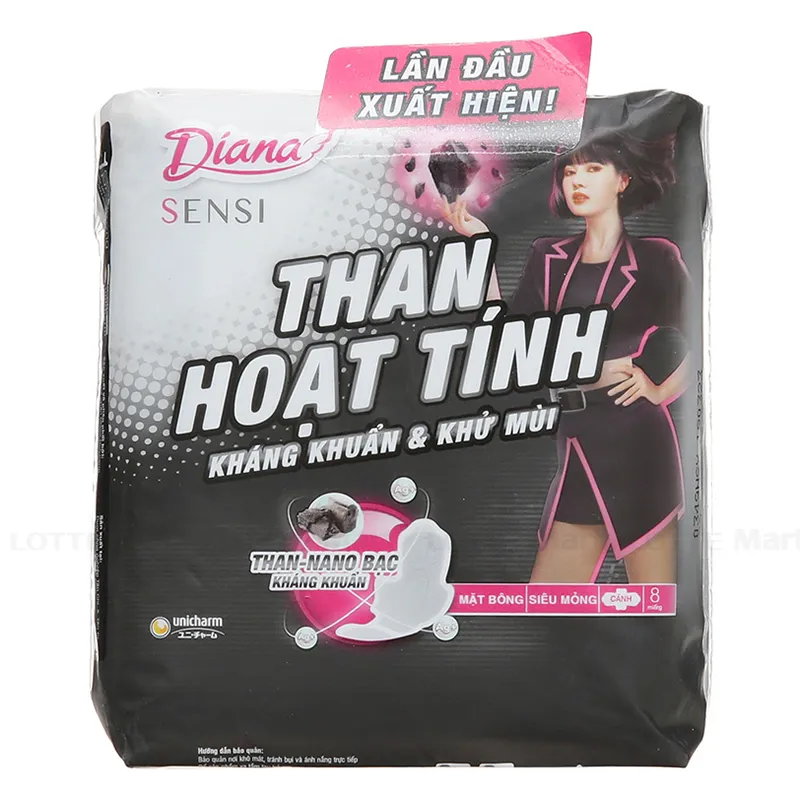Băng Vệ Sinh Diana Sensi Than Hoạt Tính Mặt Bông Siêu Mỏng Cánh Gói 8 Miếng là loại băng vệ sinh đáp ứng các yêu cầu vừa mềm mại, vừa thấm hút tốt, đồng thời phải thật mỏng nhẹ như không và không co dúm của phái đẹp. Sản phẩm là sự lựa chọn hiệu quả dành cho phái đẹp trong việc chăm sóc vệ sinh cá nhân.