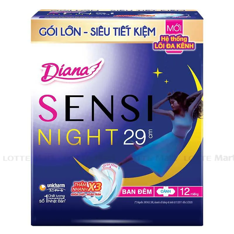 Băng Vệ Sinh Diana Sensi Night Ban Đêm Có Cánh 29cm Gói 12 Miếng
