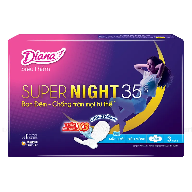 Băng Vệ Sinh Diana Super Night 35cm Gói 3 Miếng có chiều dài lý tưởng đến 35cm cùng hệ thống rãnh bảo vệ Leak Lock và thiết kế mở rộng về phía sau sẽ giúp bảo vệ bạn gái trong giấc ngủ.
