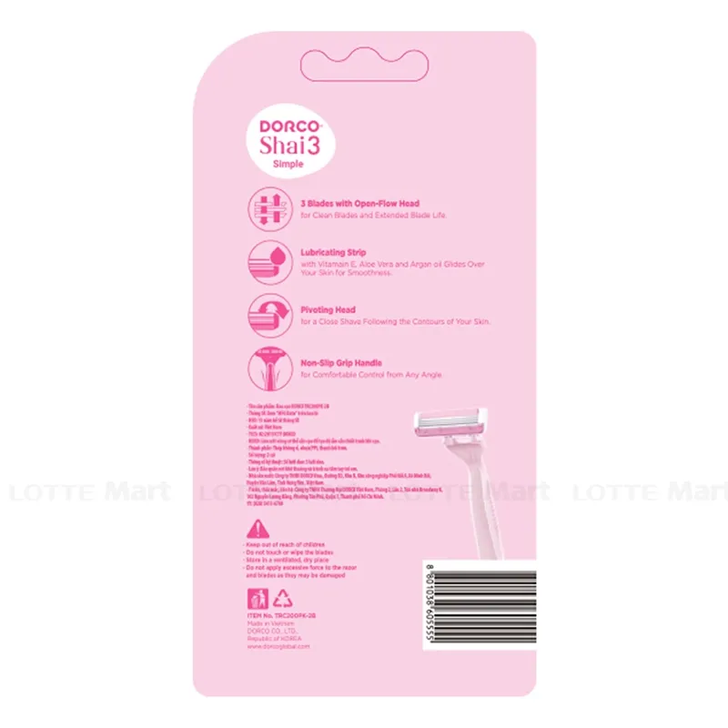 Dao Cạo Dorco Dành Cho Nữ Shai 3 Simple sử dụng chất liệu nhựa cao cấp, thiết kế đầu dao cạo cong với ba lưỡi kép giúp cho bạn cạo sạch và sát hơn theo đường cong của bạn. Thanh dưỡng ẩm chứa tinh chất lô hội, Vitamin E và oải hương giúp cho làn da dễ kích ứng của bạn cảm giác mềm mại và dễ chịu sau khi cạo. Lớp cao su chống trượt dọc theo cạnh bên của tay cầm mang lại những lợi ích đặc biệt cho bạn gái trong khi sử dụng.