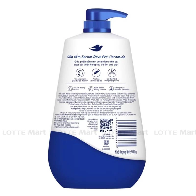 - Sữa Tắm Dove Serum Với Pro-Ceramide Da Đàn Hồi Mọng Nước mang trong mình Serum Pro-ceramide độc quyền, chứa các phân tử ceramide kích thước nhỏ dễ thẩm thấu nhanh, thúc đẩy hình thành ceramide và hàng rào độ ẩm của da, cho da căng bóng và đàn hồi sau mỗi lần tắm.