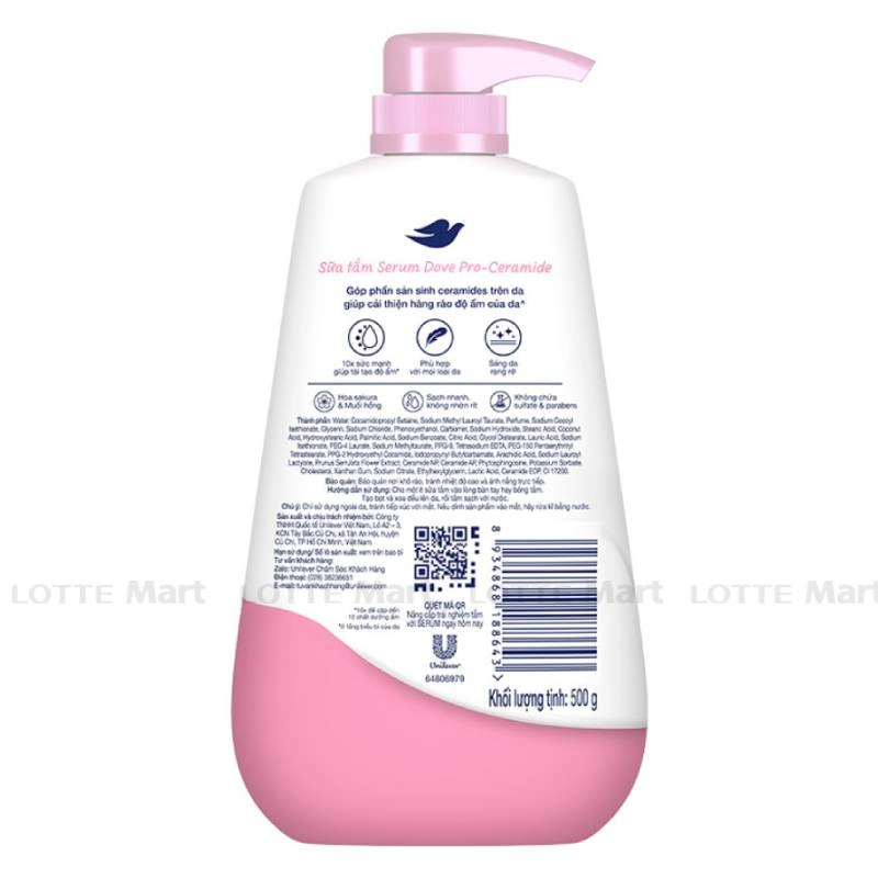 - Sữa Tắm Dove Serum Với Pro-Ceramide Sáng Da Rạng Rỡ mang trong mình Serum Pro-ceramide độc quyền, chứa các phân tử ceramide kích thước nhỏ dễ thẩm thấu nhanh, thúc đẩy hình thành ceramide và hàng rào độ ẩm của da, cho da căng bóng và đàn hồi sau mỗi lần tắm.