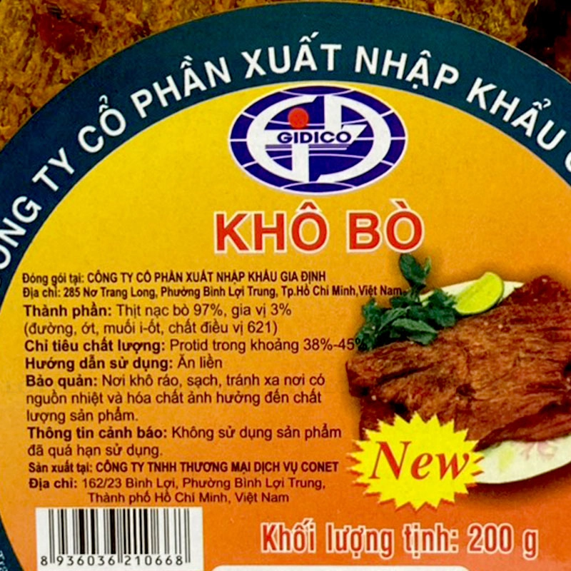 Thành phần: Thịt bò 90%, đường, bột cà ri 3%, ngũ vị hương, đường, muối