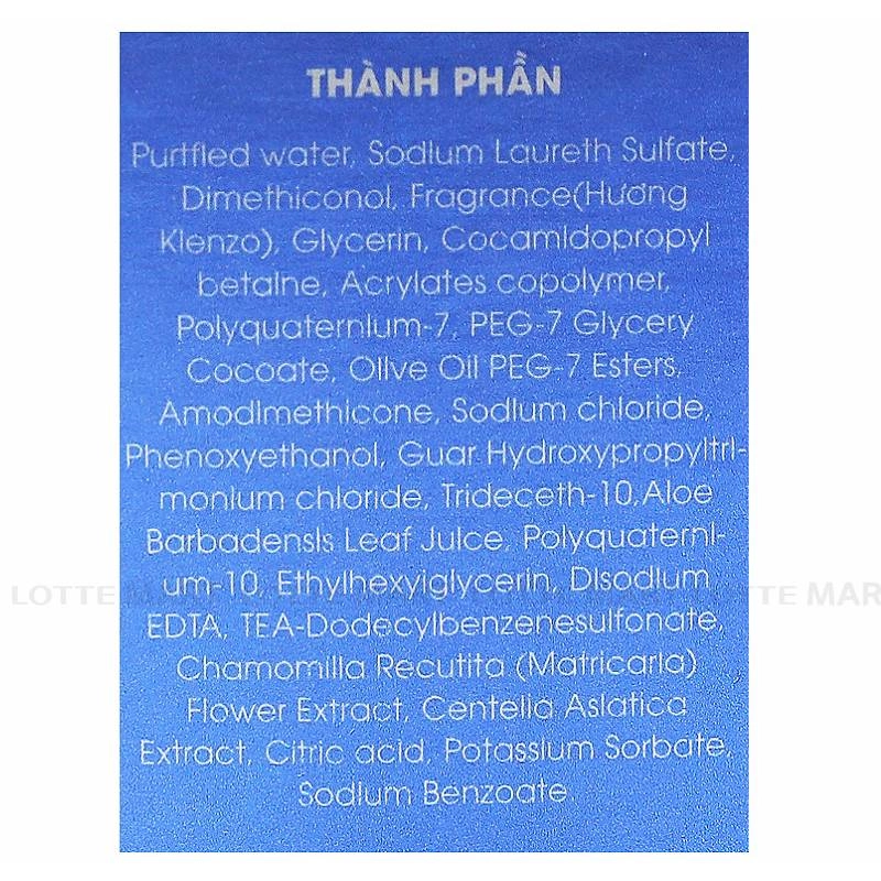 - Purified water, Sodium Laureth Sulfate, Dimethiconol, Fragrance (Hương Klenzo), Glycerin, Cocamidopropyl betaine, Acrylates copolymer, Polyquaternium-7, PEG-7 Glyceryl Cocoate, Olive Oil PEG-7 Esters, Amodimethicone, Sodium chloride, Phenoxyethanol, Guar Hydroxypropyltrimonium chloride, Trideceth-10, Aloe Barbadensis Leaf Juice, Polyquaternium-10, Ethylhexylglycerin, Disodium EDTA, TEA-Dodecylbenzenesulfonate, Chamomilla Recutita (Matricaria) Flower Extract, Centella Asiatica Extract, Citric acid, Potassium Sorbate, Sodium Benzoate.