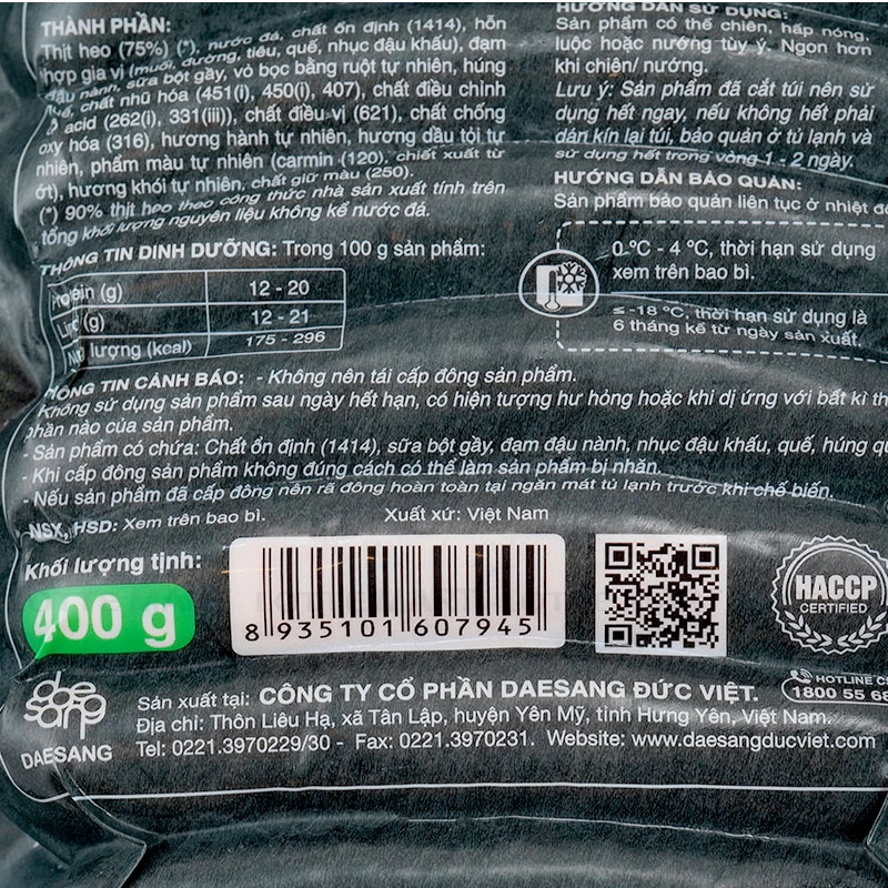 - Thịt heo 75%, nước đá, chất ổn định (1414)z, hỗn hợp gia vị (muối, đường, tiêu, quế, nhục đậu khấu), đạm đậu nành, bột sữa gầy, vỏ bọc bằng ruột tự nhiên, húng quế, chất nhũ hóa (451(i), 407),...