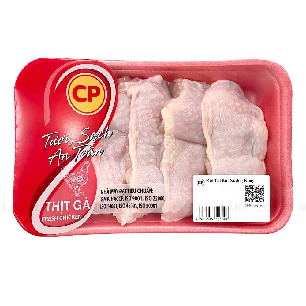 Đùi Tỏi Rút Xương CP được đóng gói trong khay xốp bọc màng co, sạch sẽ, có thể mang về làm sạch và chế biến ngay.