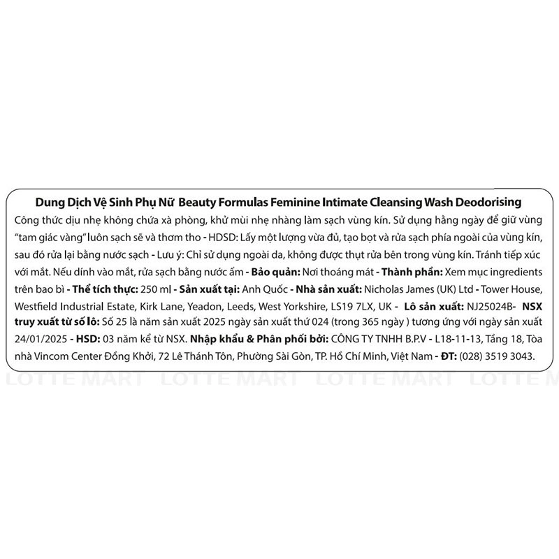 Dung Dịch Vệ Sinh Phụ Nữ Beauty Formulas Hương Phấn Khử Mùi mang công thức giúp loại bỏ các vi khuẩn gây mùi, giữ cho vùng nhạy cảm luôn thơm tho và khô thoáng suốt cả ngày dài.
